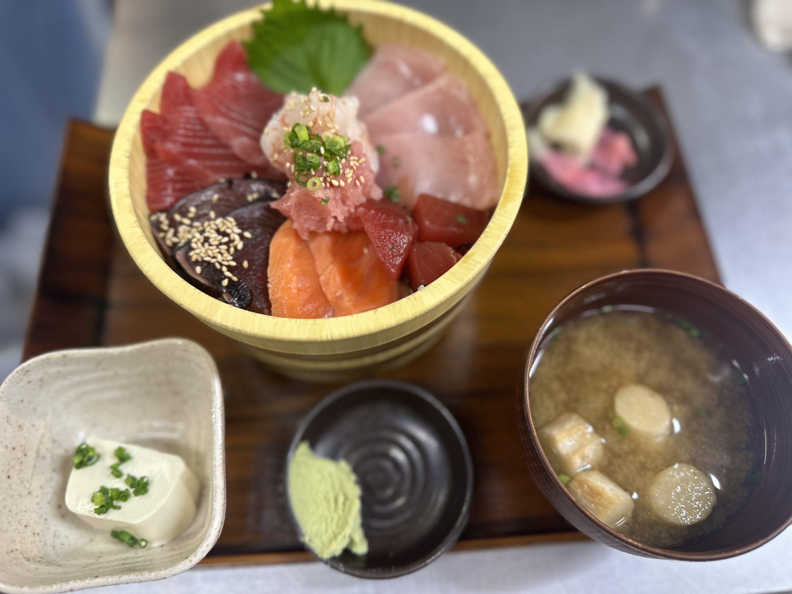 赤身、ビントロ、鰹、サーモン、ネギトロ?、エビが入った贅沢な丼!